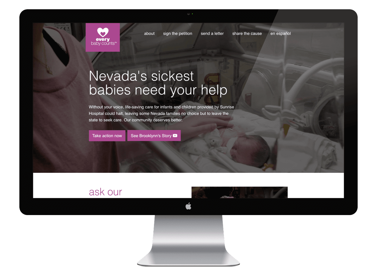 We worked with local hospital staff and effected parents to create moving videos, which urged people to support the campaign. We also built a website to provide a central location for sharing powerful stories and driving users to sign a petition or send a letter to their elected officials, encouraging them to not cut funding. Mobile optimization and smart functionality lowered the barrier to entry, while powerful creative and a robust social ecosystem supported grass roots word of mouth.